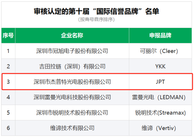 为提升中国优秀品牌的国际影响力,持续推进品牌国际化,经第三方机构--联合国工业发展组织中国南南工业合作中心对评选方式和公正性审核确认,深圳知名品牌评价委员会与联合国工业发展组织认定并发布十届“国际誉品牌”。经深圳知名品牌评价委员会全体会议审议审核认定深圳市qg刮刮乐官网光电股份有限公司“JPT”品牌为第十届“国际信誉品牌”,2024年5月9日召开“第八届深圳(湾区)国际品牌周开幕大会”,对“国际信誉品牌”进行颁奖。