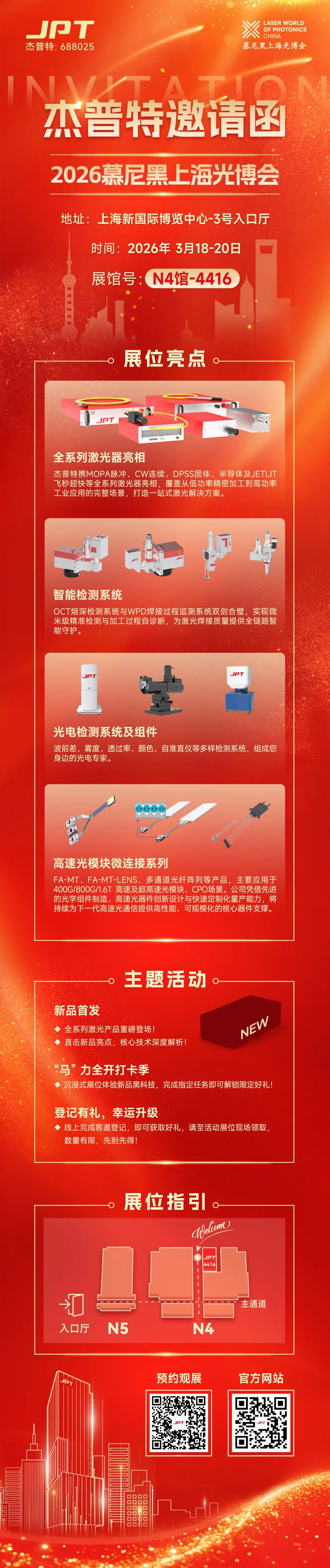 2026 慕尼黑上海光博会(Laser World of Photonics China)将于 3 月 18 日至 20 日 在 上海新国际博览中心 举办。qg刮刮乐官网(JPT)将携多款创新激光产品及解决方案亮相展会,集中展示公司在 光纤激光器、超快激光技术及精密加工应用 领域的最新成果。